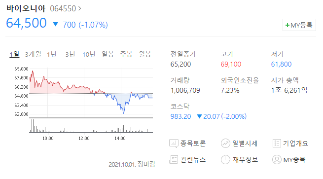 바이오니아 주가는 올해 7월 2일 RNA신약 기대감에 32.66% 오른 26000원에 마감을 한 것을 시작으로 9월 3일에는 진단키트 재료까지 포함하여 최고가인 98800원을 기록하기도 했었습니다.