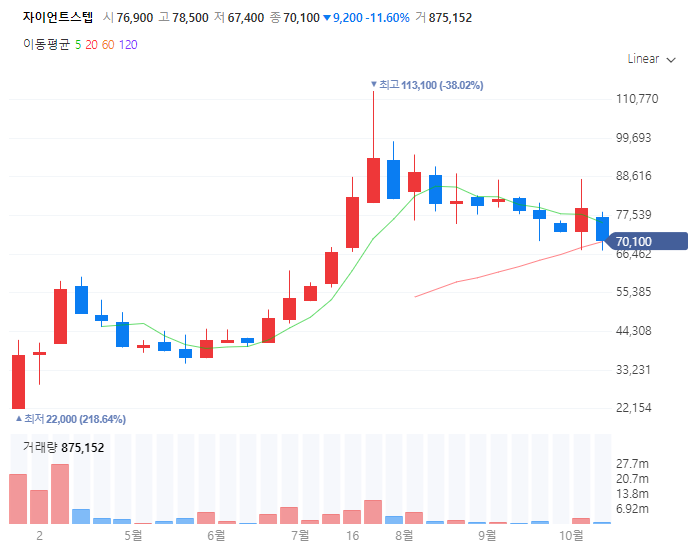 자이언트스텝 주가는 올해 6월 18일 실감형 콘텐츠 확장에 주목을 받으며 17.36% 오른 48000원에 마감했고 이후 탄력을 받아 7월 23일에는 최고점인 113,100원을 달성했는데요
