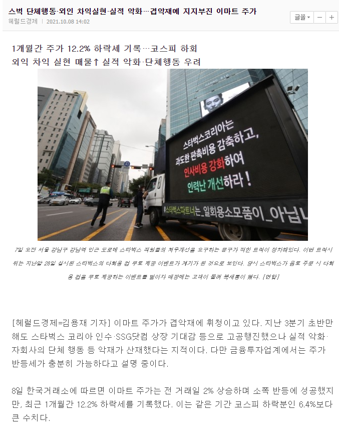 이마트는 현재 스타벅스에서 일어난 단체 행동을 두고 외인들이 일부 주가에 충격을 주었으나 이를 극복할 수 있을 것으로 보고 있는데요
