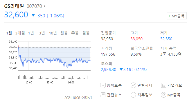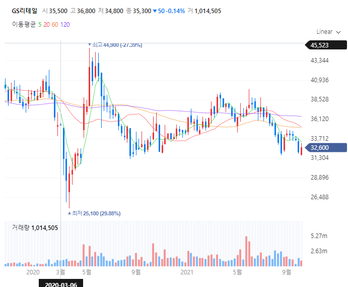 GS리테일 주가는 작년 5월 15일 재난지원금 사용처로 분류되며 12.88% 오른 42500원에 마감을 하였고 이후 재료 소진으로 꾸준히 조정되며 현재 횡보하고 있습니다.