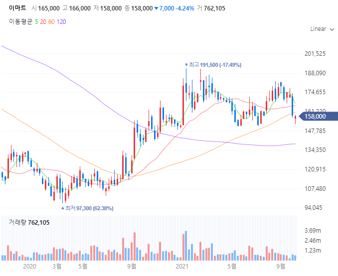 이마트 주가는 올해 1월 8일 설선물 매출 증가 기대감에 128500원에서 15만원까지 상승 후 1월 15일에는 191500원이라는 고점을 달성했는데요