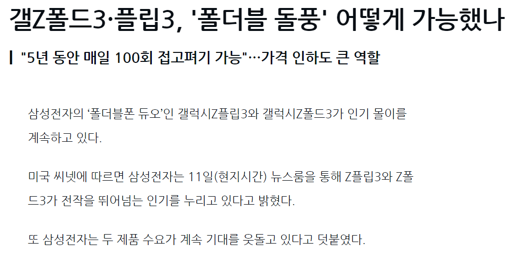 특히 Z플립3과 Z폴드3은 없어서 판매하지 못할 정도라는 레어한 이미지를 차지하고 있어 당분간 돌풍은 계속될 것으로 판단합니다.