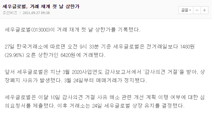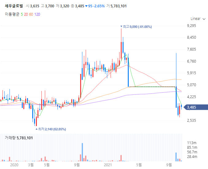 세우글로벌 주가는 작년 9월 18일 홍준표 관련주에 엮이며 4170원에서 시작한 주가는 40.29% 상승하여 5850원대에서 꾸준히 머물렀지만 올해 3월 26일 부터는 상장폐기 위기기업이라는 리스트에 분류되며 조정을 받았습니다.