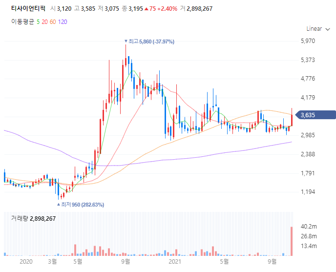 티사이언티픽 주가는 작년 7월 3일 가상화폐 가격이 상승하자 빗썸의 지분 8% 가량을 보유하고 있다는 소식에 강세를 보여 41.58% 오름세를 보였고 현재 조정 후 3635원에 머물고 있는데 현재 들어가는걸 추천하지는 않습니다.