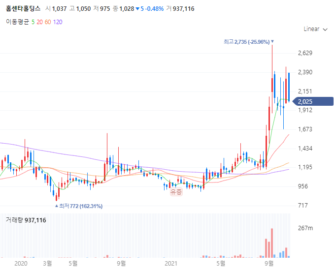 홈센타홀딩스 주가는 올해 8월 27일 홍준표 의원에 대한 지지율 상승에 영향을 받아 시가 1205원에서 1590원에 마감된 것을 시작으로 9월 10일에는 2735원까지 상승 했는데요