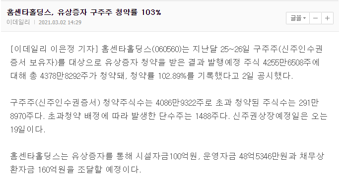 홈센타홀딩스는 올해초 유상증자를 통해 채무상환자금과 시설자금을 조달한바 있고 이후로는 홍준표 관련주에 얽혀 뚜렷한 전망은 없는 점 참고하시길 바랍니다.