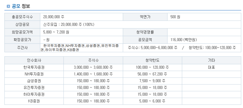 주간사는 한국투자증권, NH투자증권, 삼성증권, 유진투자증권, 하이투자증권, KB증권이며 1인 청약한도는 10만-12만주가 될 것으로 보이는데 저렴하다보니 1인배정량이 굉장히 많은 것을 볼 수 있죠. 수요예측결과는 7200원으로 될 가능성이 높습니다.