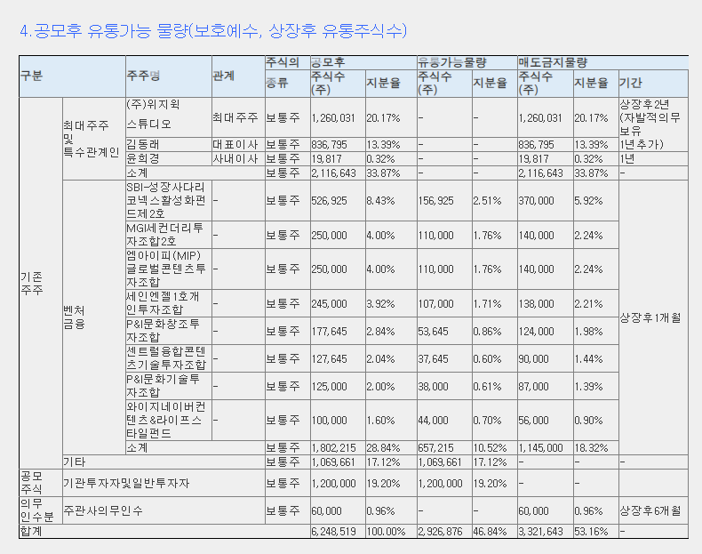 상장직후 유통가능물량은 19.20% 이며 모두 기관 투자자와 개인투자자들로부터 나오는데요