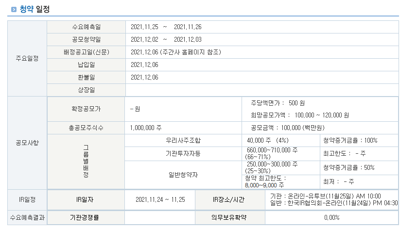 수요예측일은 11월 25일부터 26일까지이며 청약일정은 12월 2일부터 3일까지 가능한데 한국투자증권 계좌는 11월 30일까지 개설이 되어야 청약에 참여하실 수 있는 점을 아시면 좋을 것 같습니다.