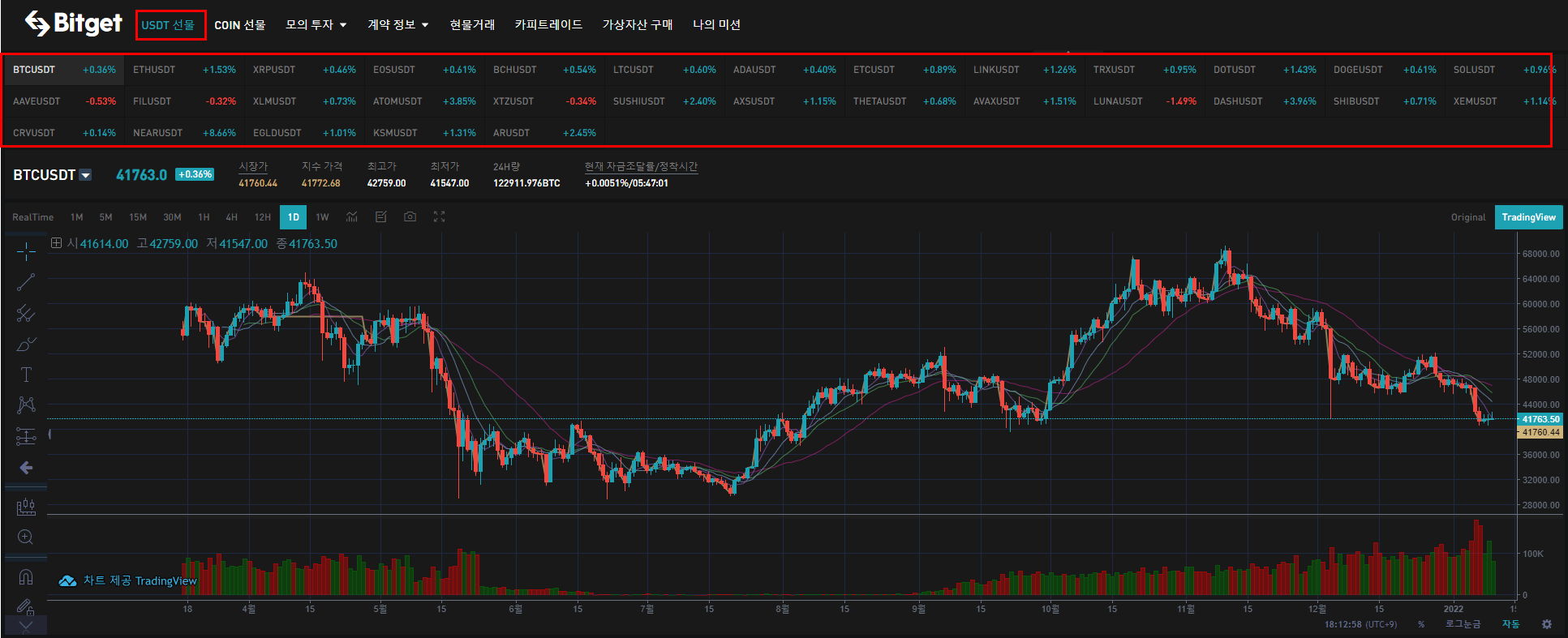 비트겟 선물거래 방법은 좌측 상단의 USDT 선물에서 거래하고자 하는 코인 선택 및 보조지표 등을 설정하여 투자여부를 판단합니다.